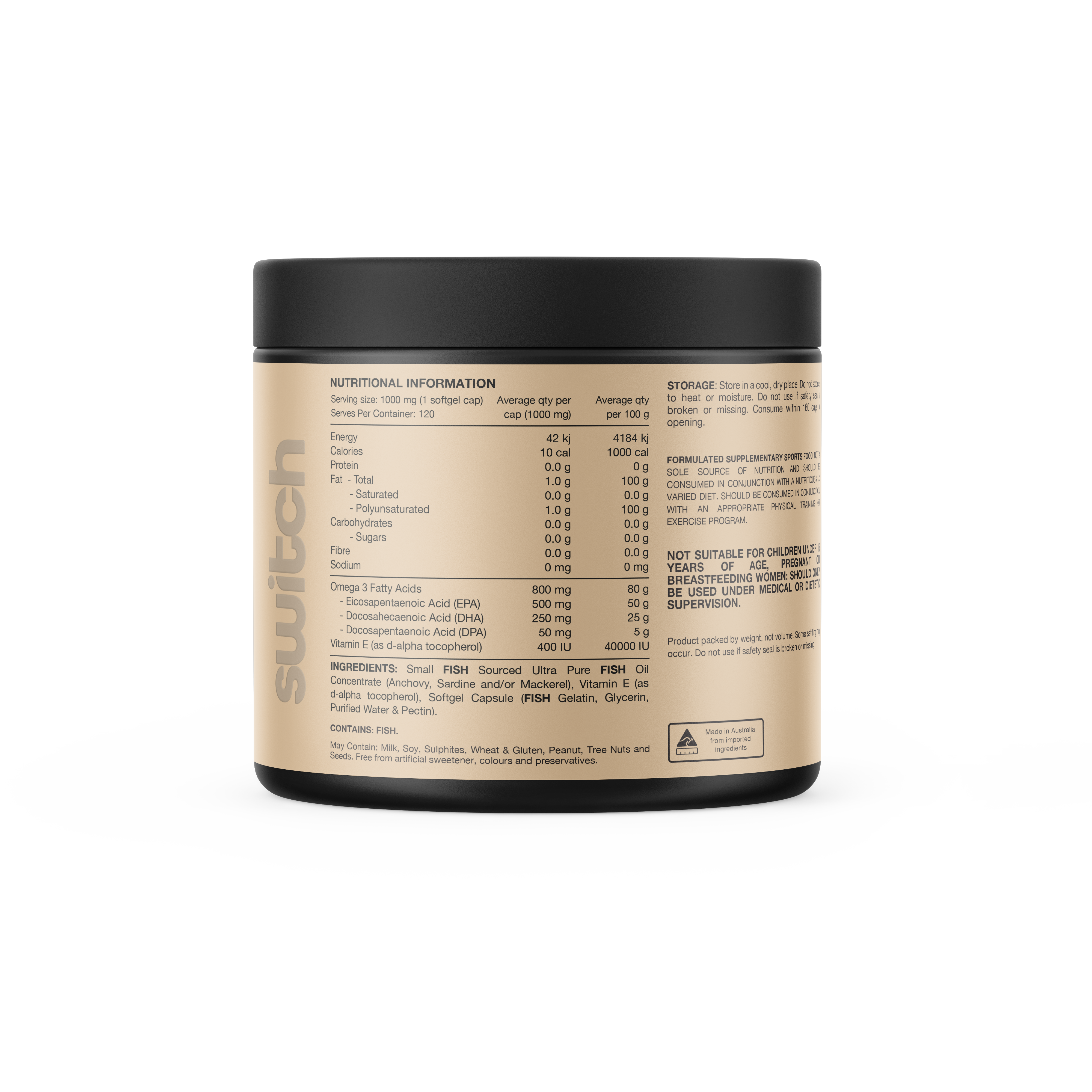 Switch uses high-quality, purified fish oil sourced sustainably to deliver a potent ratio of EPA and DHA with minimal oxidation and maximum absorption.